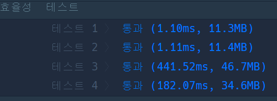 음...테스트1, 2는 두 번째 풀이가 더 빠르고 3, 4는 첫 번째가 풀이가 더 빨랐다.