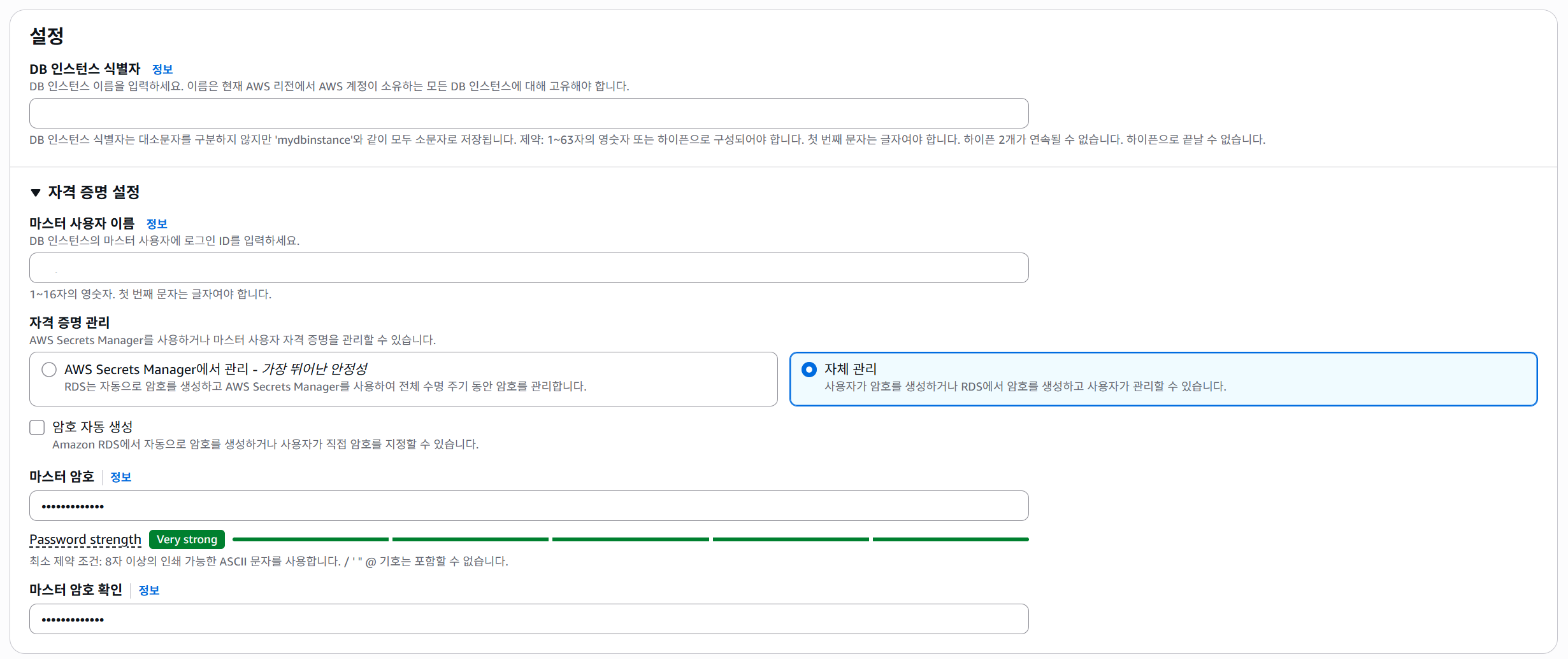 본인이 원하는 값 설정: DB 마스터 사용자 이름 및 암호