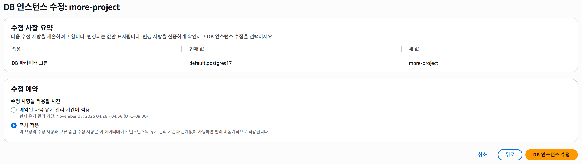 22. RDS 대시보드에 가서 수정 눌러서 추가 구성
