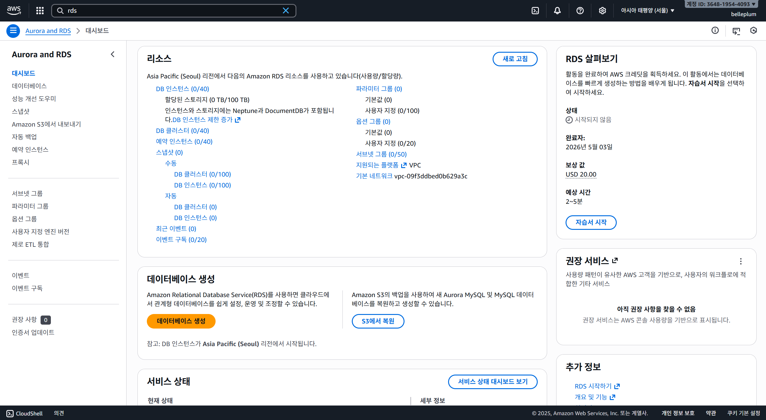 6. 검색창에 RDS 검색 후 대시보드에서 데이터베이스 생성 클릭