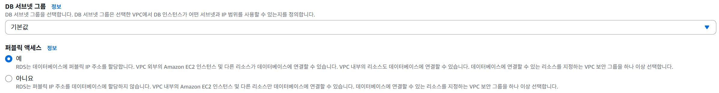 퍼블릭 액세스를 '예'로 설정하면 DB가 인터넷에 노출되므로, 반드시 보안 그룹(Security Group) 설정